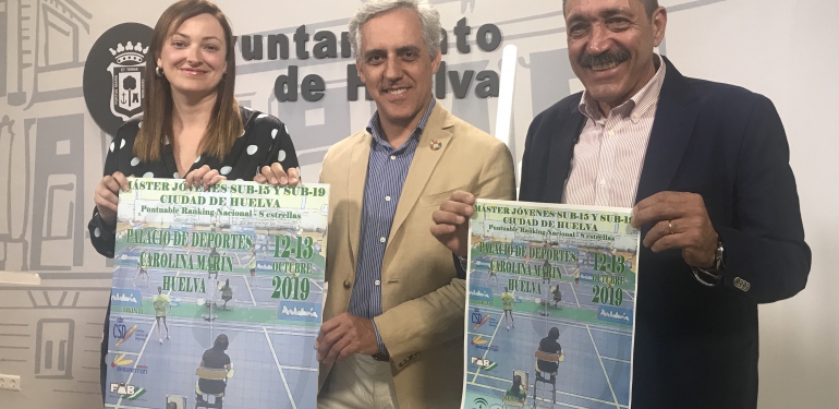 El Máster Jóvenes Sub-15 y Sub-19 «Ciudad de Huelva», que se celebra en el Palacio de Deportes «Carolina Marín» de la capital onubense los días 12 y 13 de octubre, dio el pistoletazo de salida ayer con la presentación del evento en la Sala de Prensa del Excmo. Ayuntamiento de Huelva. La concejala de Participación Ciudadana y Deportes, María Teresa Flores; el diputado provincial José Manuel Alfaro; y el presidente de la Federación Andaluza de Bádminton, Carlos Longo, se encargaron de hablar de esta competición puntuable para el ESP Rn Jóvenes con la categoría de 8 estrellas, la máxima para este tipo de competiciones.